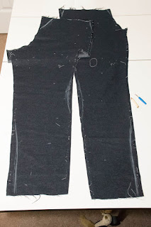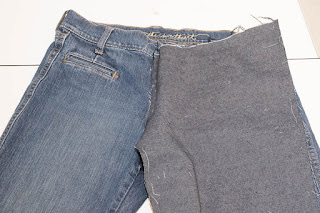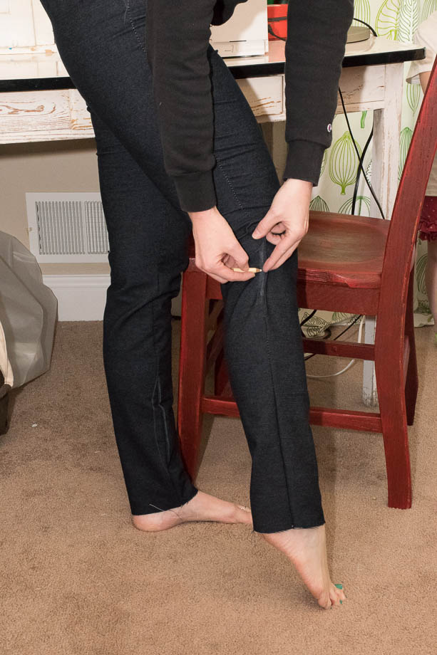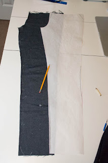 When cutting out the pants you need to make them more of a straight leg. Cut out the proper size through the waist/hip/butt and starting down the thigh, but then as the pant pattern tapers you have to just keep going straight down. Do the same thing with the front as well as the back. Make sure to cut the waist down so that you can do the knit waistband and it's not too high up. I initially cut off approximately 1.5" from the waist (as you can see in the pictures below), but then ended up cutting another 1" from it before attaching the waistband. (Here is our yoga waistband modification tutorial)