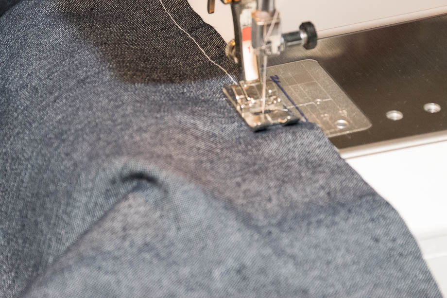 Sew the pocket lining to the pant along the opening curve with the right sides facing together. Repeat with the other side. Turn right side out (so the pocket lining is now on the back/wrong side of the pant and you see the pant part) and top stitch.