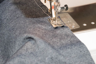 Sew together the side seams of of the front and back pieces, then open up and top stitch. Repeat with the other side. (Doing it in this order just makes it easier to top stitch. There's no circle of fabric to mess with!) Then sew together the center rise seams front and back followed by sewing together the entire inseam of the pants.